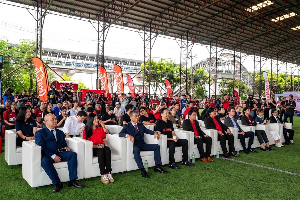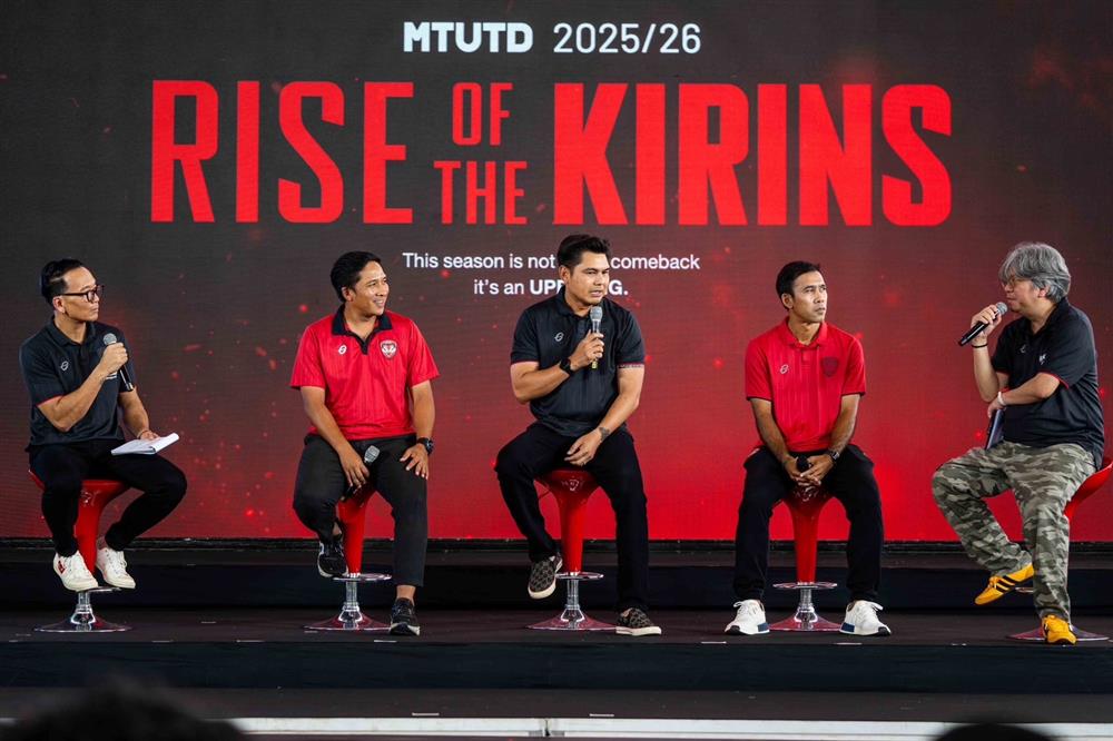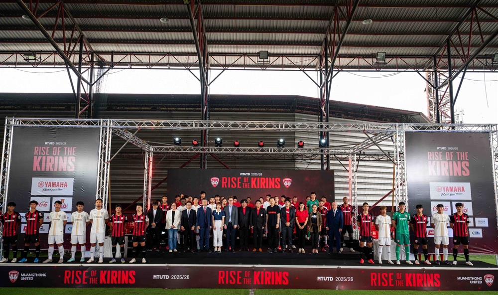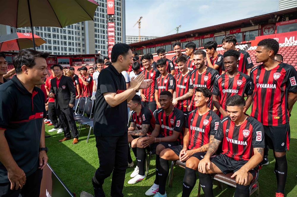 นายพงศธร เอื้อมงคลชัย ประธานกรรมการบริหาร นายภาณุพล กิตติคำรณ ผู้จัดการใหญ่ด้านการค้า นายอุกฤษณ์ ภาควิวรรธ รองผู้จัดการใหญ่ด้านวางแผนการค้า และการตลาด บริษัท ไทยยามาฮ่ามอเตอร์ จำกัด ถ่ายภาพร่วมกับนายวิลักษณ์ โหลทอง ประธานสโมสรเมืองทอง ยูไนเต็ด นายรณฤทธิ์ ซื่อวาจา ผู้อำนวยการสโมสรเมืองทอง ยูไนเต็ด พร้อมด้วยแข้งดัง ในงานแถลงข่าวเปิดตัวสโมสรเมืองทอง ยูไนเต็ด ภายใต้แคมเปญ “RISE of the KIRIN” กิเลนผยอง...ทะยานสู่ความสำเร็จยุคใหม่