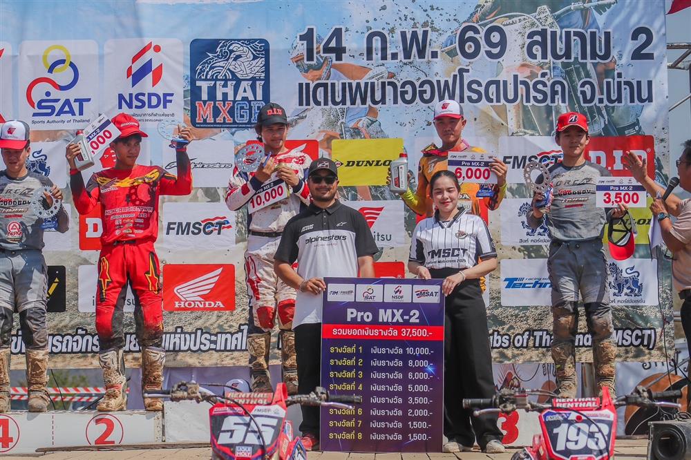 ขณะที่การแข่งขันในรุ่น MX-2 Pro “คิ้วท์” พันธกานต์ บุญชาลี หมายเลข 17 บิดยอดรถแข่ง Honda CRF250R ทีม Honda Asia Bowin Idemitsu S Motor ระเบิดผลงานคว้าอันดับที่ 2 มาครอง โดยมี “ไตรตั้น” เตโชดม มีแสง หมายเลข 193 จากทีม Honda Racing Thailand Idemitsu Wannalak Motorsport ตามมาในอันดับที่ 3 บนโพเดียม