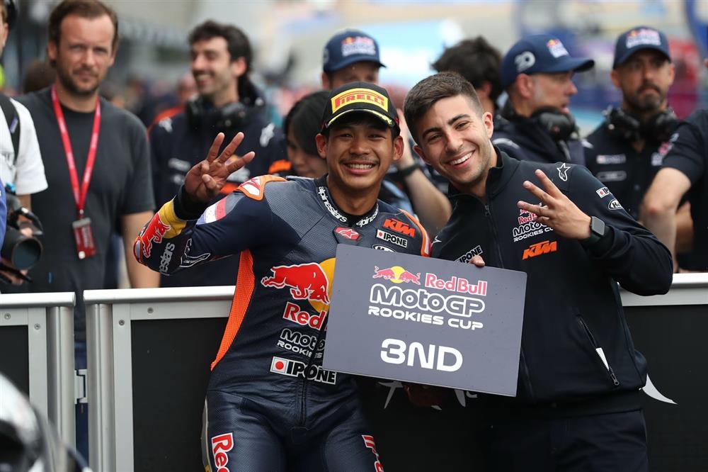 "ไม้คิว” เกียรติศักดิ์ สิงหพงศ์ นักบิดดาวรุ่งจาก “ฮอนด้า เรซซิ่ง ไทยแลนด์” เจ้าของหมายเลข 85 สร้างผลงานแซงเดือดด้วยการฝ่าฝนคว้าโพเดียมอันดับที่ 3 มาครองได้สำเร็จ ซึ่งการแข่งขันนี้เน้นตัดสินด้วยฝีมือและทักษะของนักแข่งเป็นหลักเนื่องจากทุกคนจะได้รับรถในสเปคเดียวกัน โดยในการแข่งขัน เรซแรก มีฝนตกลงมาอย่างต่อเนื่องในช่วงก่อนการแข่งขัน ในศึก เรดบูล โมโตจีพี รุกกีส์ คัพ 2026 สนามแรก เฮเรซ ราวด์ ที่ เซอร์กิโต เด เฮเรซ – อังเคล นีเอโต ประเทศสเปน เมื่อวันเสาร์ที่ 25 เมษายน ที่ผ่านมา